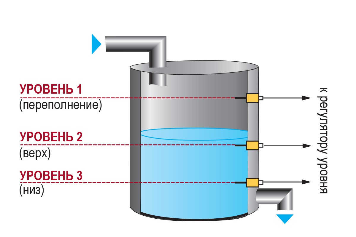 Принцип действия кондуктометрического датчика основан на разнице между электропроводностью воздуха и жидкости. Эта разница фиксируется двумя электродами: сигнальным, установленным на необходимом уровне, и общим. Когда поверхность жидкости соприкасается с сигнальным электродом, происходит замыкание между двумя электродами.