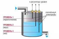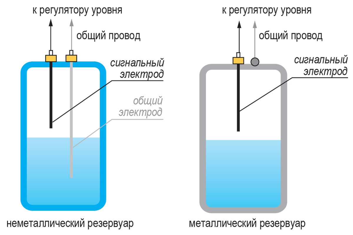 В металлических резервуарах количество применяемых для измерения сигнальных электродов соответствует числу измеряемых уровней, а общим электродом служит стенка резервуара. В этом случае потребителю следует приобрести один или несколько датчиков (в зависимости от количества сигнализируемых уровней) с электродами соответствующей длины.
