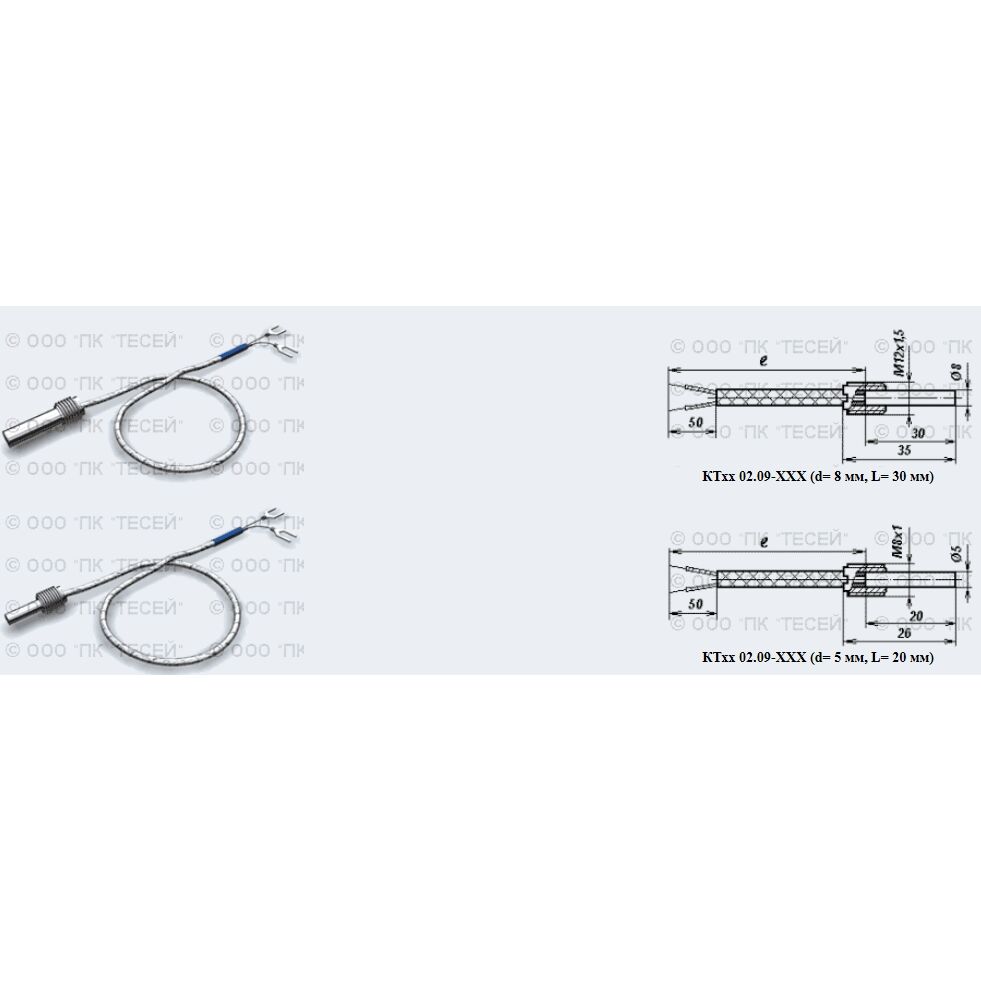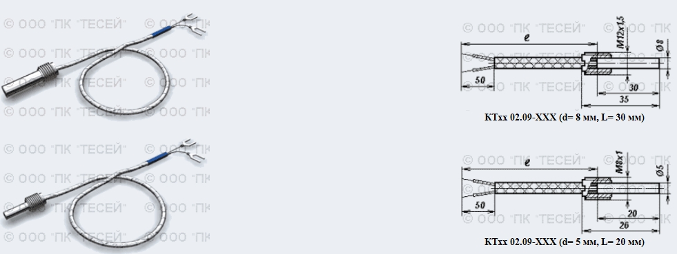 Обозначение и примеры записи при заказеКТхх 02.09-ХХХ - (D)к2 - И(Н) - С10(Л) - d - L / lКТХА 02.09-060 - к2 - Н - С10 - 5 - 20 / 2000 -термопреобразователь градуировки хромель-алюмель конструктивной модификации 02.09-060 с удлинительным проводом в изоляции фторопласт-экран-фторопласт, класс допуска 2, рабочий спай не изолирован (Н), стальная гильза (С10) диаметром (d) 5.0 мм, монтажная длина (L) 20 мм, длина удлинительного провода (l) 2000 мм."